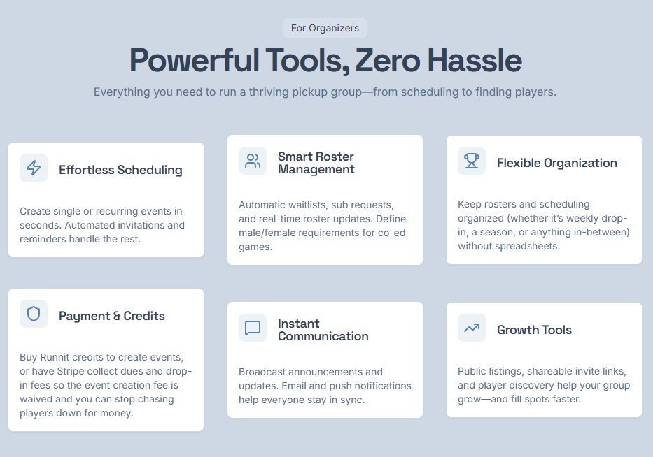 A guide for group organizers (league admins): create events, manage RSVPs/waitlists, run sub requests, send reminders, and manage payments confidently.